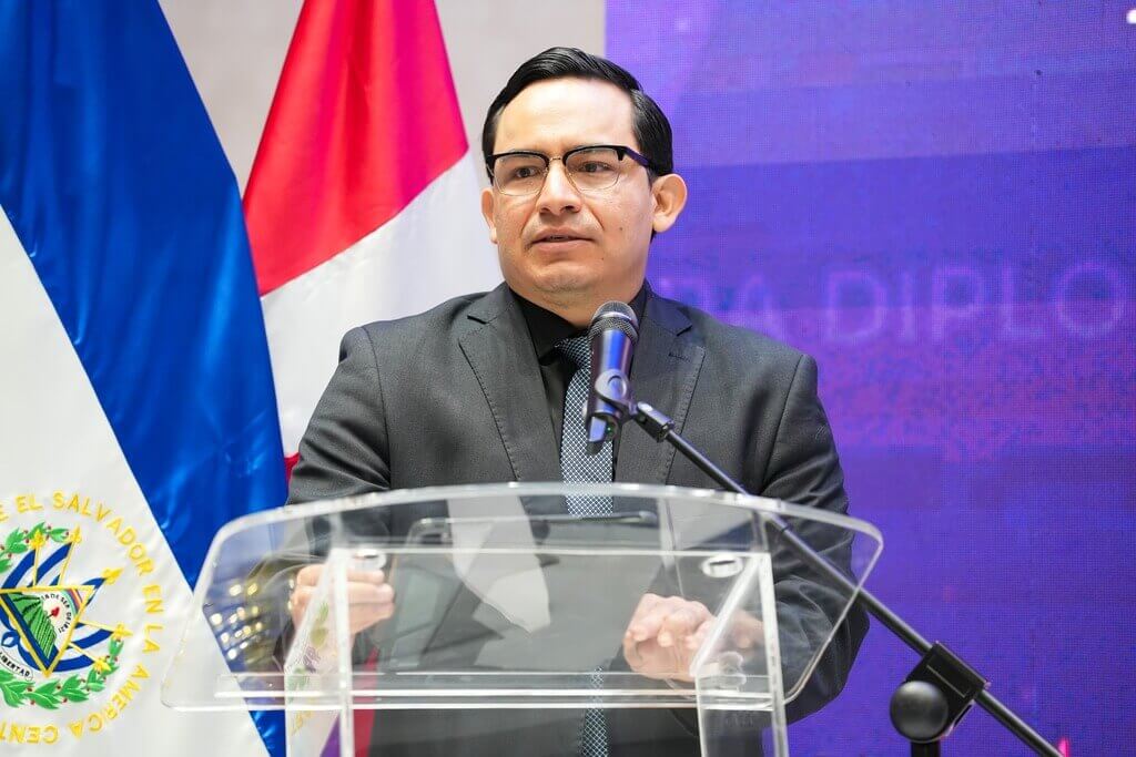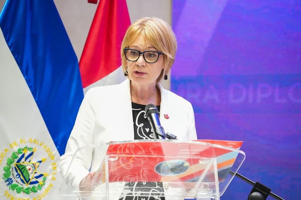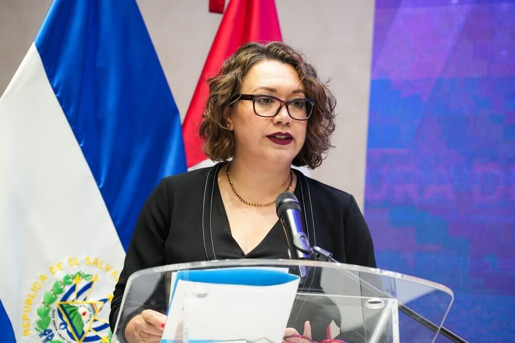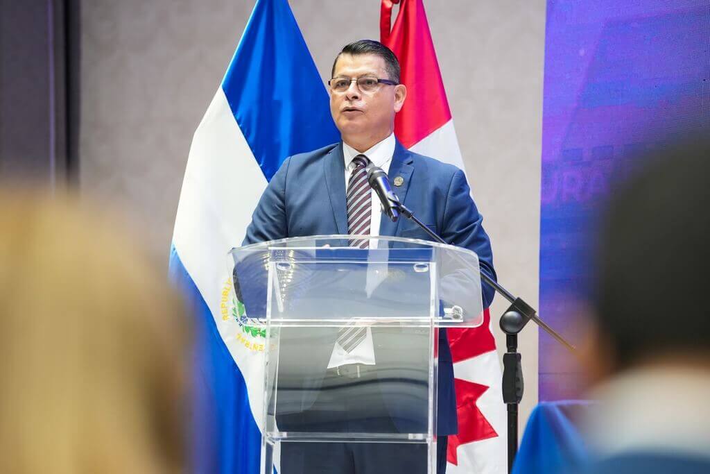 La mesa de honor estuvo conformada por el Magistrado Presidente de la CSJ, Dr. Henry Alexander Mejía; el Consejero Presidente del CNJ, Lic. Miguel Angel Calero Angel; el Director de la DGA, Lic. Benjamín Mayorga; la Jefa de la Oficina País de la ONUDC, Sra. Berta Nayelly Loya; y la Embajadora de Canadá en El Salvador, Sra. Mylene Paradis.