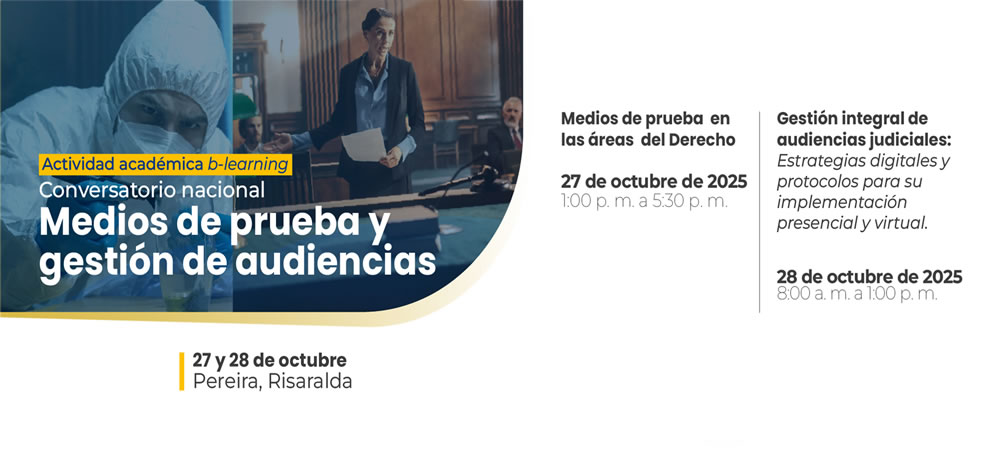 Bogotá, D.C., 6 de octubre de 2025. El Consejo Superior de la Judicatura, a través de la Escuela Judicial “Rodrigo Lara Bonilla”, convocan al Conversatorio Nacional Medios de Prueba y Gestión de Audiencias. Jornadas académicas que se realizarán de manera presencial y remota los días 27 y 28 de octubre de 2025 en Pereira - Risaralda.