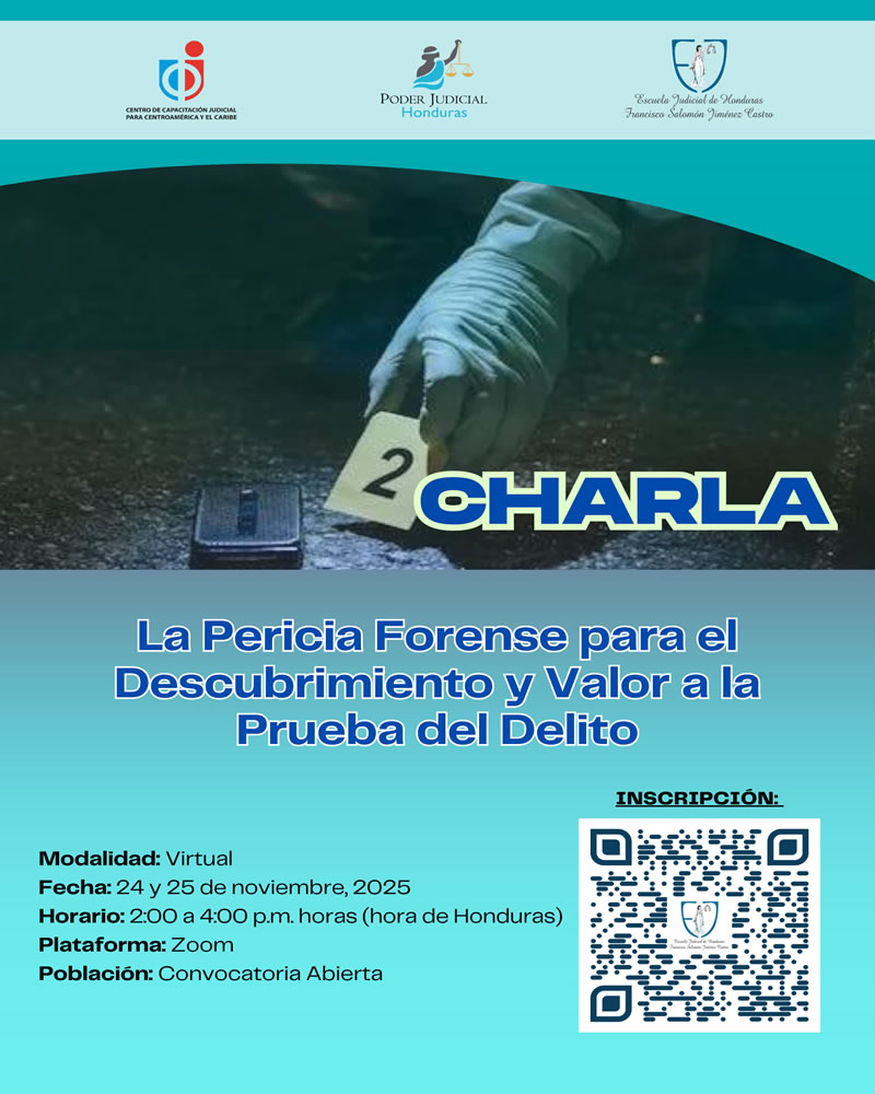 Charla sobre LA PERICIA FORENSE PARA EL DESCUBRIMIENTO Y VALOR A LA PRUEBA DEL DELITO a desarrollarse los días lunes 24 y martes 25 de noviembre, 2025 en Horario de: 2:00 p.m a 4:00 p.m.(Hora de Honduras)